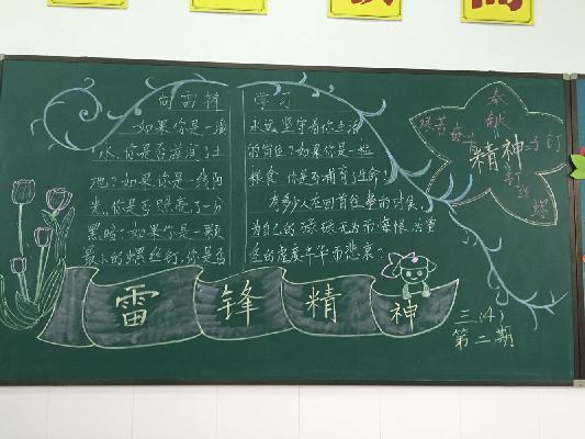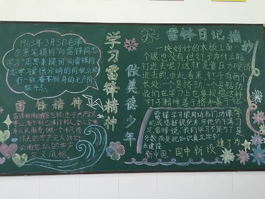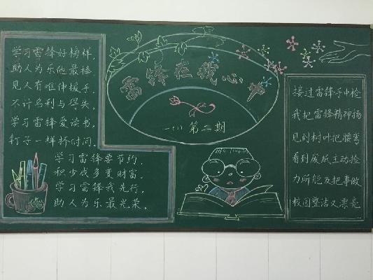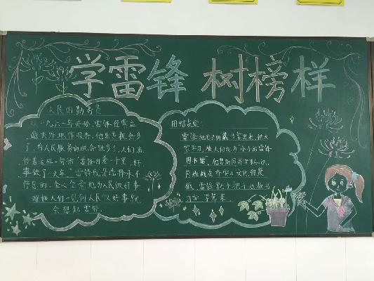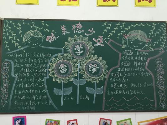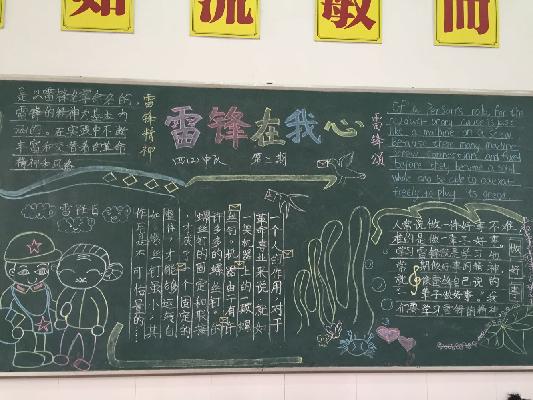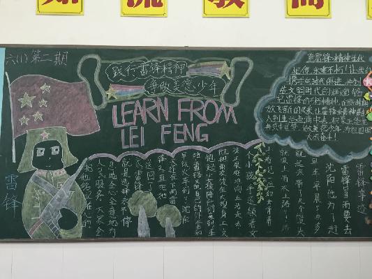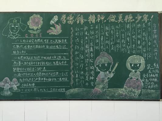 各班都能结合三月份活动主题“学雷锋精神,做美德少年”,认真出好黑板报。其中一1、一3、二2、三1、三4、四1、四2、五1、五2、五3、六1班的黑板报图文并茂,色彩明朗,书写整齐,整体效果较好。
