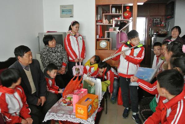 曹爷爷和谢爷爷和蔼可亲,知道孩子们来看望他们,都早早地在楼下迎接。把孩子们引进门,热情地招呼大家坐下。慰问活动中,同学们及老师为老人送上了水果、牛奶、点心、手工作品等,为老人打扫卫生,还为老人表演了精彩的节目:魔术、笛子独奏、唱歌、相声、小品……一张张稚气未脱的脸上,映着满满的真诚。现场气氛异常活跃,爷爷和奶奶也高兴地和唱、打拍子。最后,同学们给老人送上了自己诚挚的祝福,和老人合影留念,纷纷表示有空会经常来看望他们。