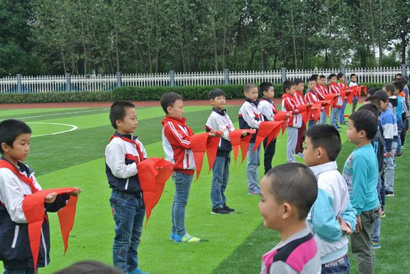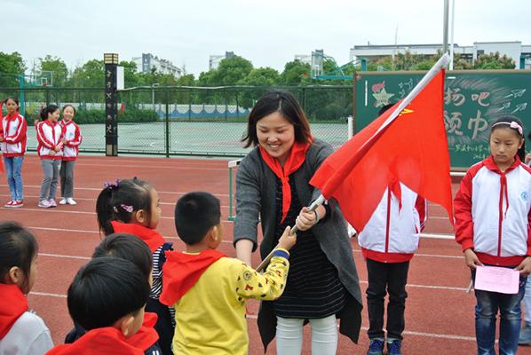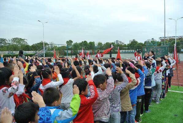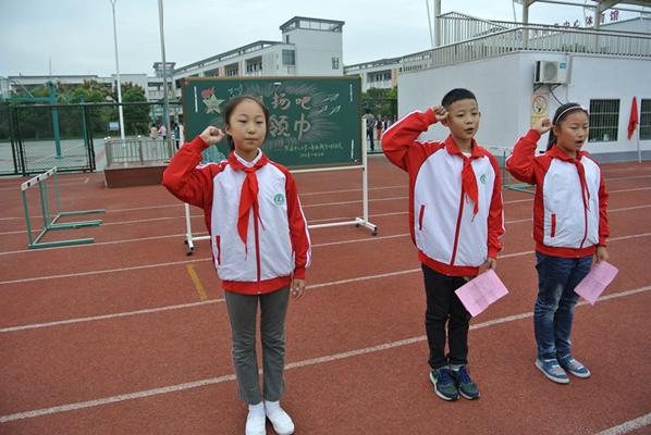 仪式上,队员们个个精神抖擞,排着整齐的队伍,少先队大队长王迪芸宣布了一年级新生入队名单。当四年级的哥哥姐姐把鲜艳的红领巾献给小同学时,操场沸腾了,整个操场汇成了一片欢乐的海洋,涌动着红色的春潮……在少先队副大队长朱茜睿的带领下,新队员们面向鲜红的队旗,举起右拳,庄严宣誓,稚嫩的声音,铿锵有力。接着,大队辅导员丁丽霞老师为各中队授旗,用充满激励的话语对新队员的加入表示欢迎和祝贺,愿队员们牢记习近平爷爷的寄语“从小学习做人,从小学习立志,从小学习创造”,早日把自己培养成为有理想、有道德、有文化、有纪律的社会主义事业接班人。