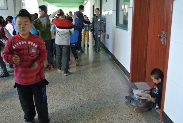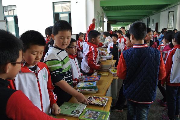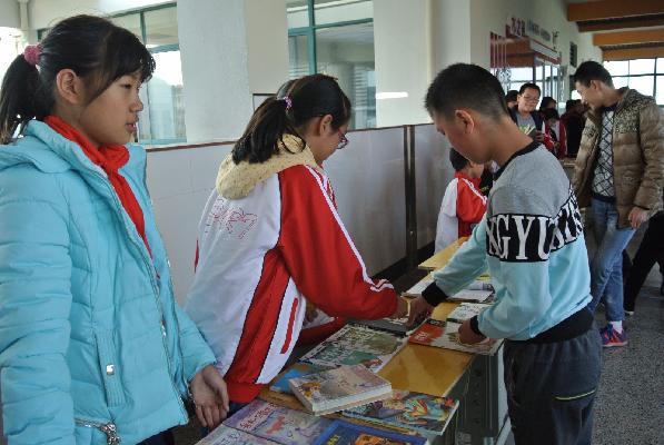 一楼到三楼的走廊上摆满各式书摊,同学们纷纷将家中闲置或已看完的课外书拿到书摊上来交易,有的扯着嗓子大声吆喝叫卖:“好书在这里,买一送一喽……”、“清仓大甩卖,好书大减价”、“走过路过,千万不要错过,全场2元起售……”有的干脆抱着一摞好书,到处兜售……而买书的同学,忙着穿梭于各个书摊,精心挑选着自己喜爱的书。有的淘到一本好书,就席地而坐,迫不及待地看了起来。在一个多小时的书市活动中,一笔笔“生意”成交了,一本本好书传递着知识与快乐,同学们脸上都洋溢着满足的笑容。
