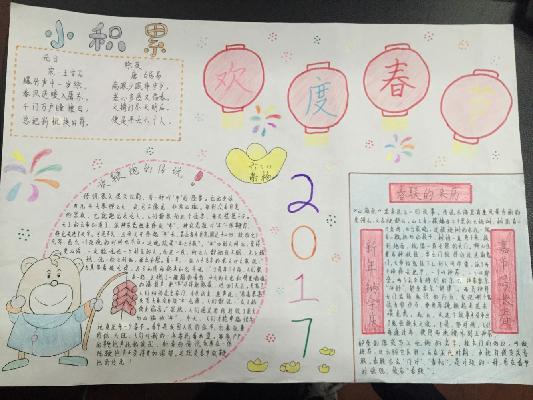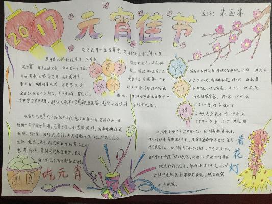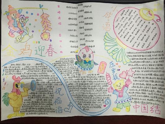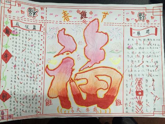 1、“节日小报”制作活动。五年级围绕元宵节主题,六年级围绕春节主题,小报作品质量非常的高。有的手抄报上的艺术字就像是电脑上印刷的一样,有的同学把舞龙、舞狮、放烟花爆竹、贴春联等欢乐的场景栩栩如生的搬到了手抄报上,今年是鸡年,昂首挺胸的金鸡也是手抄报上的热门配图。一等奖获得者:五4陈雅菲、六2张烨、六4谢文洁。二等奖获得者:五1孙英姿、五2刘湘、五3朱茜睿、向丽慧、六1汤倩、六2潘圆梓。三等奖获得者:五1陈炫睿、黄佳梦、五2朱香霖、朱诗涵、五3谢雯琪、五4费雨涵、衡泽渔、欧文政、六2莫佳琪、六4周悦。