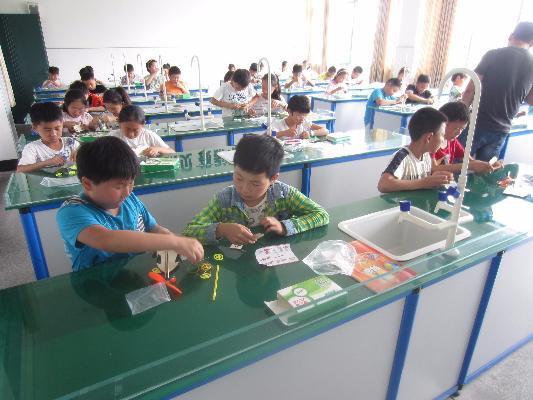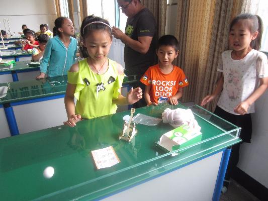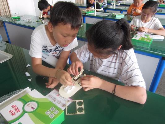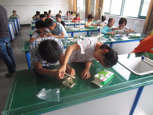 实验现场,三、四年级的同学们分组开展了“投石器”、“橡皮筋动力车”、“风向指示仪”、“废纸制作3D眼镜”、“液压挖掘机”、“指纹鉴定”等实验材料的制作;五年级的同学们在老师的指导下,使用资源包中的木棍、纸板、盐水、电池等生活中常见的简易材料,完成了“风力发电”、“水果电池”、“盐水小车”、“污水净化装置”、“造纸术”、“太阳能小车”、“废板新利用——DIY验钞机”等生动有趣的科学实验。在动手操作中,同学们了解了力学、光学原理,了解了电磁、风能、太阳能相互转化的基本原理,掌握了污水分层净化和制作吸尘器的简易方法,让同学们真切地体会到科学真的很好玩,环保真的很重要。