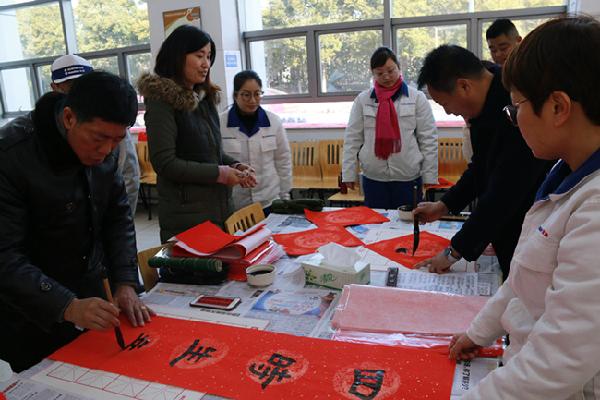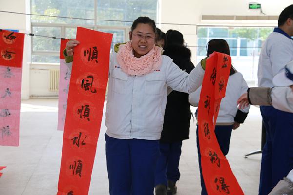 2月6日,在常州豪爵铃木摩托有限公司工会活动现场,丁书记与7名书画老师用娴熟的笔法,泼墨挥毫,书写春联,当企业工友们手捧带有文化内涵和浓郁节日气氛并饱含真情的春联时,张张笑脸伴随笔墨飞扬……面对工友们热切的期盼,书法爱好者们热情高涨,写了一幅又一幅,直到中午12点,墨尽纸光,工友们仍然意犹未尽。据统计,此次活动共写送了300多幅春联和300余个“福”字。2月7日,丁书记与书法家协会成员、部分民间书法爱好者走进了空港社区,给更多的社区居民朋友送上一份祝福和温暖,一方面为新年的到来营造浓厚的节日氛围,另一方面也是想通过这种方式弘扬我们的传统文化。2月8日、2月9日,罗溪镇文化站组织的本次公益活动还将在镇集贸市场、青莲社区开展活动。