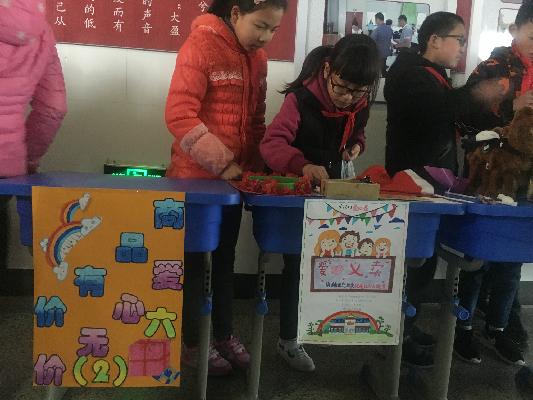 孩子们将自己平时节省下来的文具用品、闲置的书籍和作业本、超龄玩具整理出来,标明了价格,整整齐齐地摆放在摊位上,还有现做的水果沙拉、冰激凌蛋糕、蛋挞等,整个文化长廊俨然成了一个大型“超市”,“小老板”们都跃跃欲试,等待“小顾客”们的光临和挑选。“走过,路过,不要错过……”“甩卖啊,甩卖……”叫卖声此起彼伏。为了说服别人购买自己的商品,队员们使出浑身解数,妙招频出。“打折出售”、“买一赠一”……,还有的干脆拿着东西向熟悉的老师和同伴推销。“小顾客”们也没闲着,他们在叫卖声的吸引下,来回不停地穿行,一会儿在那讨价还价,一会儿跟朋友介绍自己买的宝贝。活动结束后,很多队员还意犹未尽,在老师们的催促下才依依不舍地“收摊”回家。