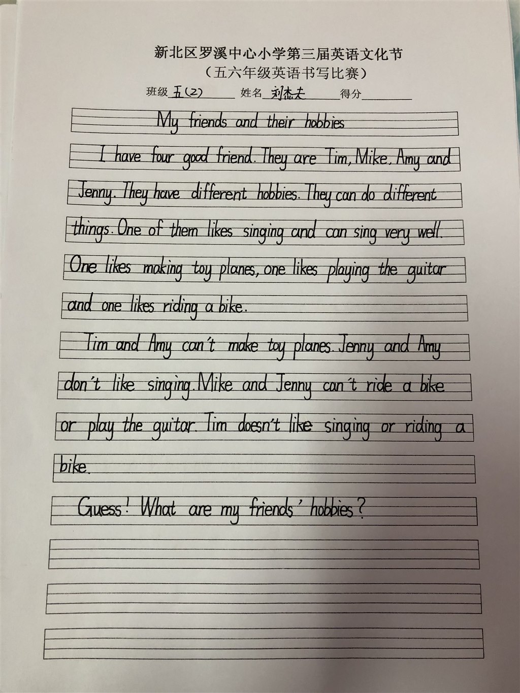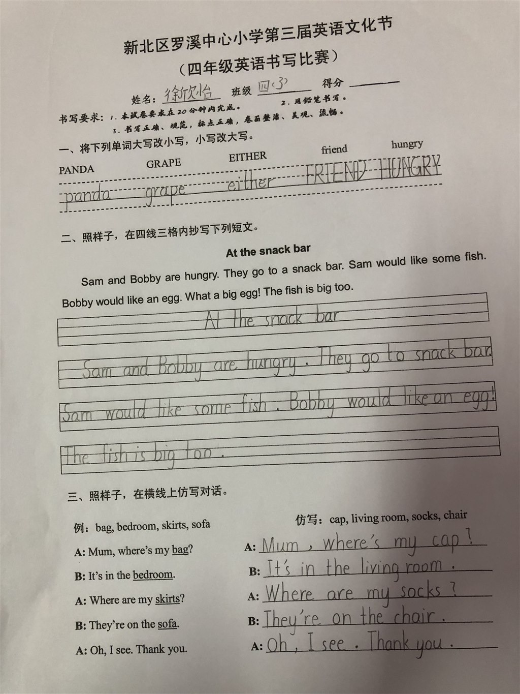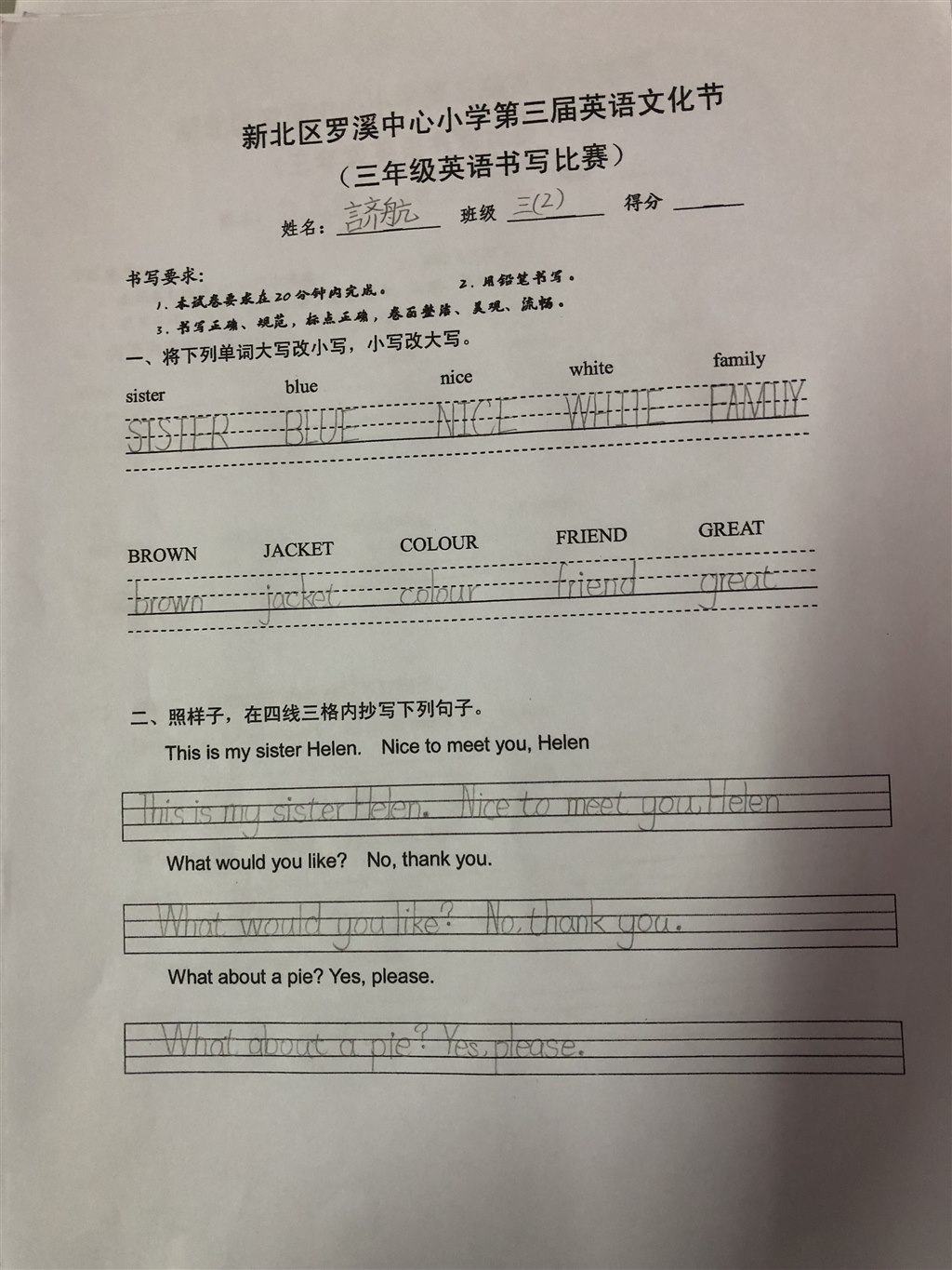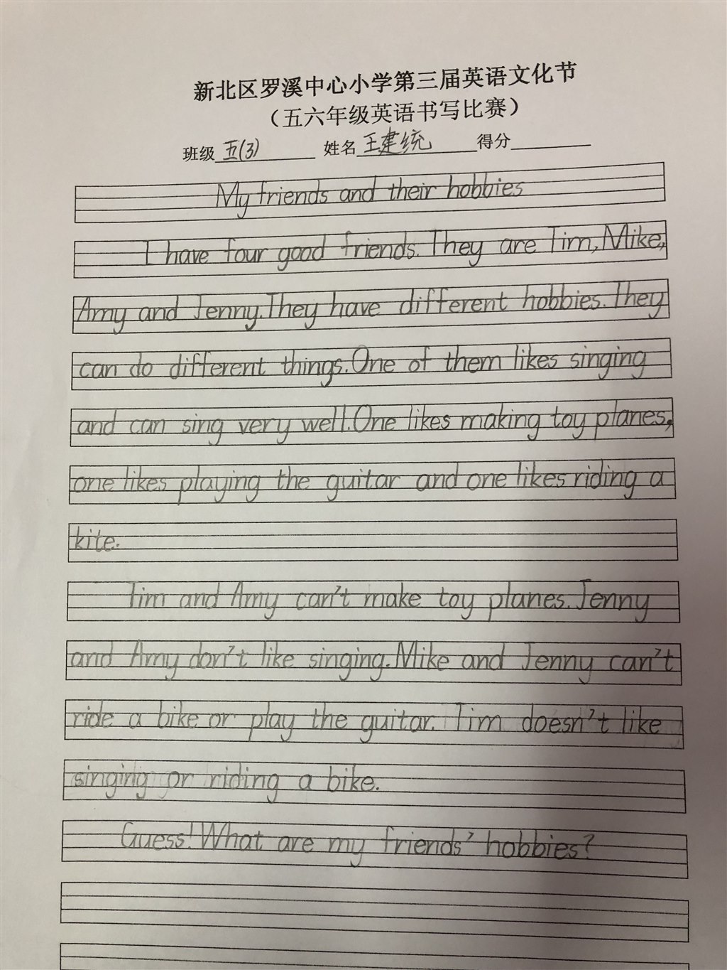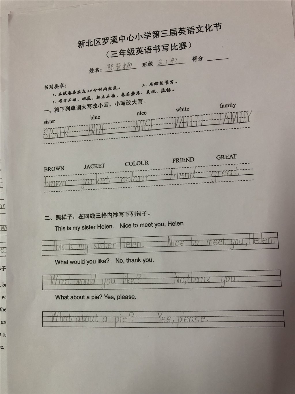 为了提高学生对英语规范字体书写的认识,增强书写规范的意识,培养学生良好的书写习惯,提高学生的英文书写水平,我校在12月20日上午短课时间组织进行了三至六年级学生英语书写比赛。