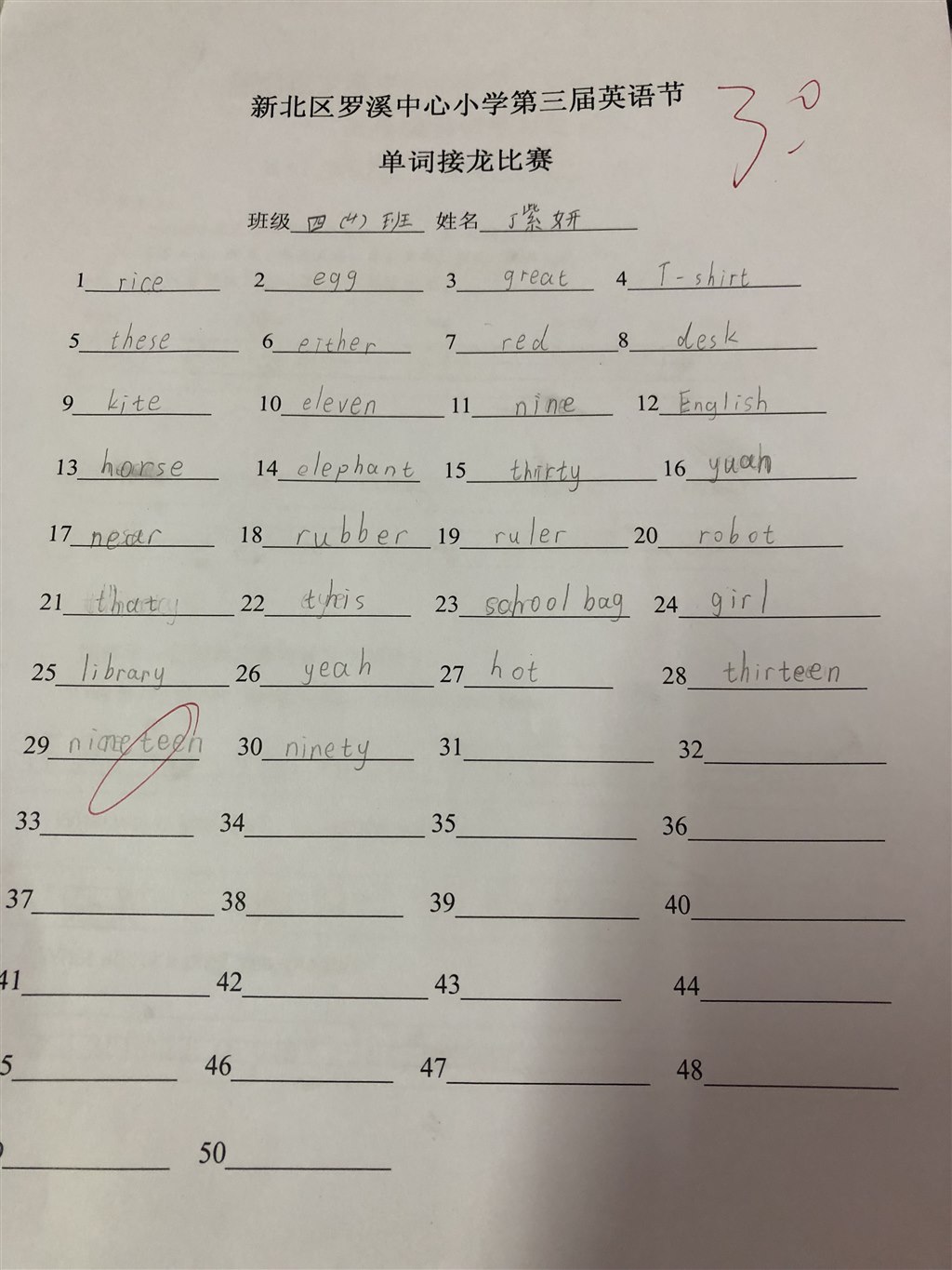 本次活动旨在通过竞赛,让孩子们深刻认识到英语单词的重要性,挖掘学生的学习潜能,营造浓厚的英语学习氛围。四年级各班在班级选拔的基础上,推荐5名优秀选手参加年级比赛。比赛中要求学生根据老师提供的初始单词的末字母进行单词接龙,在规定的时间内看哪位同学完成得既多又对。赛场上,孩子们争分夺秒,奋笔疾书,竞争十分激烈。最终,四(2)班的谷玙铖同学在2分钟之内完成了38个正确单词,夺得了冠军。