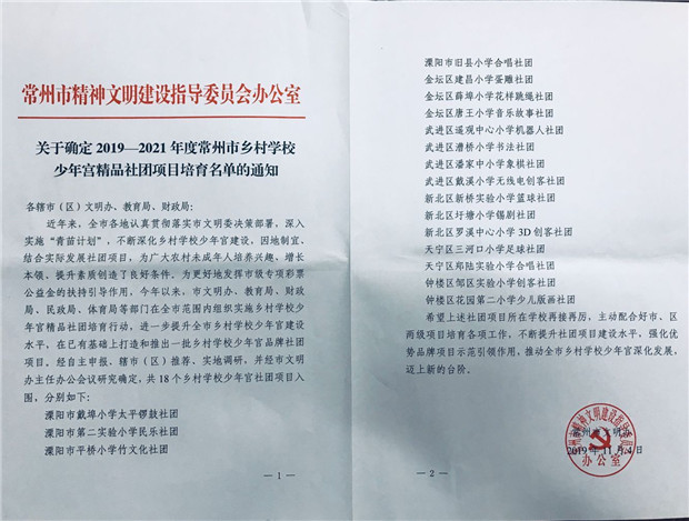 为认真贯彻落实市文明委决策部署,深入实施“青苗计划”,日前,由市文明办、教育局、财政局、民政局、体育局等部门在全市范围内组织实施了乡村学校少年宫精品社团培育行动,进一步提升全市乡村学校少年宫建设水平,在已有基础上打造和推出一批乡村学校少年官品牌社团项目。经自主申报、辖市(区)推荐、实地调研,并经市文明办主任办公会议研究确定,共18个乡村学校少年官社团项目入围,罗溪中心小学3D创客社团获市精品社团。