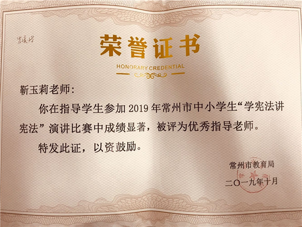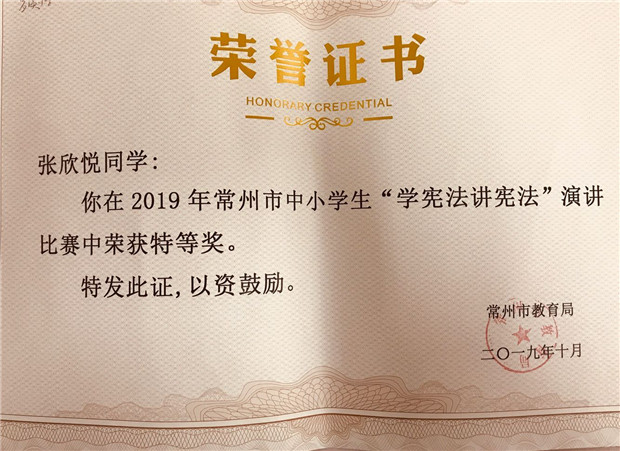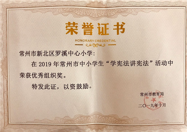 11月11日,罗溪中心小学喜获常州市教育局颁发的“学宪法,讲宪法”演讲比赛优秀组织奖的荣誉证书。10月中旬,由常州市教育局组织的市中小学生“学宪法,讲宪法”演讲比赛在江苏省常州高级中学隆重举行。新北区罗溪中心小学张欣悦同学在获得区一等奖的基础上代表新北区参赛,在全市众多选手中脱颖而出,以小学组总分第一的优异成绩荣获特等奖。靳玉莉老师获优秀指导老师。