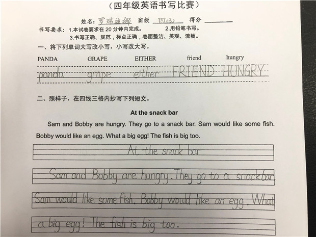 为了提高学生对英语规范字体的认识,增强规范书写的意识,培养学生良好的书写习惯,同时提高学生的英文书写水平,我校在12月12日上午短课时间组织了三至六年级学生进行英语书写比赛。