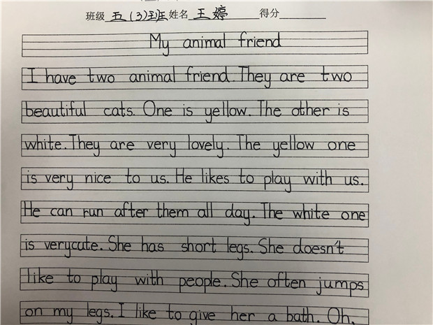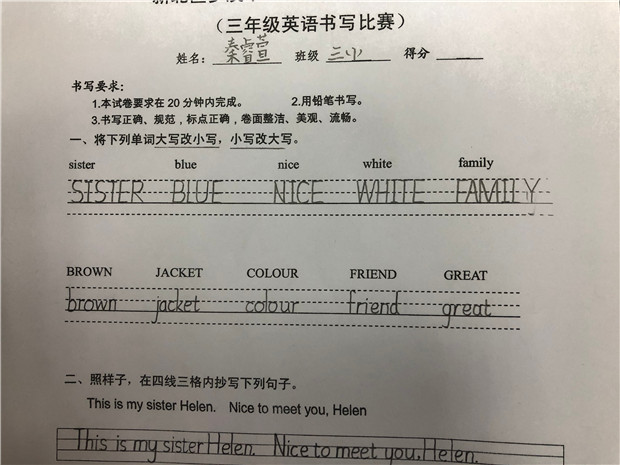 比赛以班级为单位,在各班教室内统一进行。要求学生在20分钟内完成规定的书写内容,具体比赛内容由英语老师根据本学期教学内容确定。三、四年级用铅笔书写,内容以单词、短句为主,五、六年级用黑色水笔书写,内容以语段为主。书写过程中,学生们一丝不苟,充分展示了自己的书写水平。其中以获奖学生最为典型,他们的作品漂亮美观,整洁大方,内容充实完整,具有一定的视觉美学效果,彰显出英语书法艺术之美。