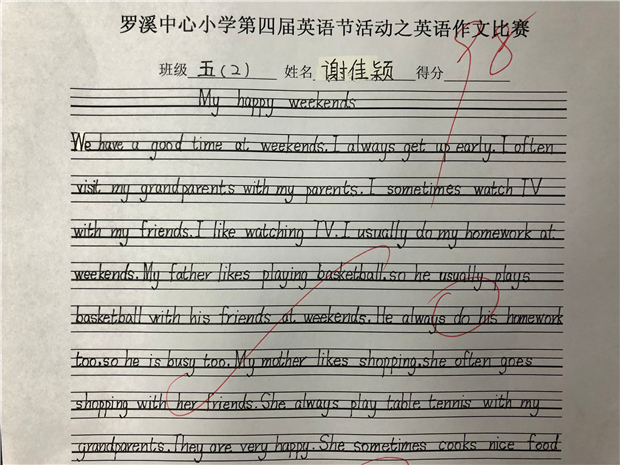 本次比赛本着“人人参与”的原则,首先在全校五、六年级7个班级中,各任课老师组织了初赛,在严格筛选的基础上,每班选出了5名优秀选手参加决赛。五年级以《My ____ weekends》《My friend》为题;六年级则以《Keep our school clean》《The changes of my family》为题,学生们任选一个题目现场发挥,要求在40分钟的时间内写出一篇英语作文。能做到用词准确,符合语法,语言流畅,内容丰富。