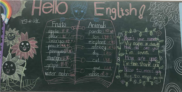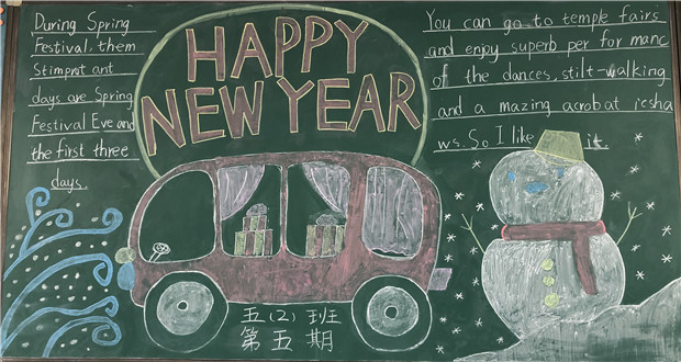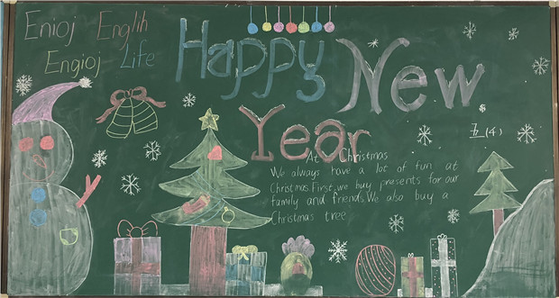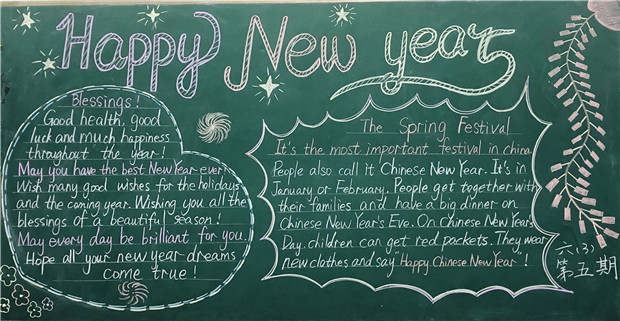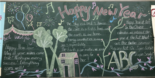 在第四届校园英语节活动中,三至六年级的同学们开展了以“Happy New Year”为主题的黑板报比赛活动。在本次活动中,各班学生群策群力,相互合作,查资料、找素材、积极动手,情趣盎然。此次黑板报内容丰富多彩,每个班的黑板报无论从版面设计,还是内容的搜集、挑选到编辑,从美工到书写,无不凝聚着学生的智慧与心血。一幅幅生动形象、内容丰富、图文并茂的黑板报,也成了班级里中一道亮丽的风景线,也为同学们新增了一个品味文化、学习英语知识的园地。