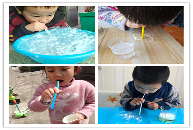 先来看看这周低年级的“小豆丁”们在家自制泡泡水玩起来了吹泡泡的游戏。