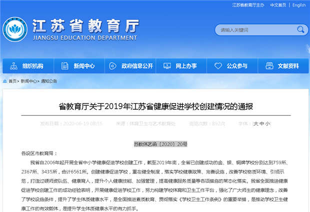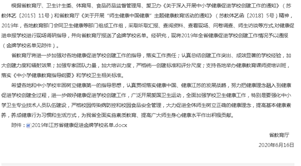 近日,从省教育厅发布的“关于2019 年江苏省健康促进学校创建情况的通报”(苏教体艺函〔2020〕20号)中获悉,罗溪中心小学成功获评“2019年江苏省健康促进金牌学校”。