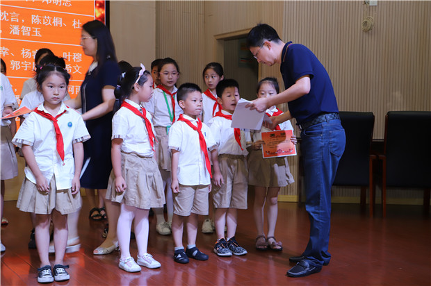 在闭幕式上,首先由条线分管朱曦铣老师回顾了本次活动的过程:黑板报评比、科技种植之绿色班级评比、科技种植之大豆种植活动、小制作小发明、科技幻想画、科技实践活动“2019年鞋子去哪了”、劳动技能大比拼,学生们在丰富多彩的活动中收获满满。朱老师向为本届科技节付出艰辛努力的教师和积极参加此次活动的同学们表示衷心的感谢,对在科技节上各项竞赛中获奖的班级和学生表示热烈的祝贺。随后罗溪镇社会事业服务和保障中心的施小仙主任、殷国伟校长、徐建峰副校长、谢红琴副校长分别给优秀科技辅导员、科技小明星、劳动小达人进行了颁奖。