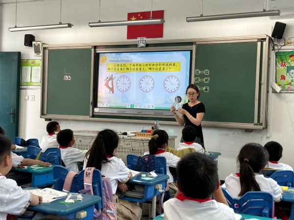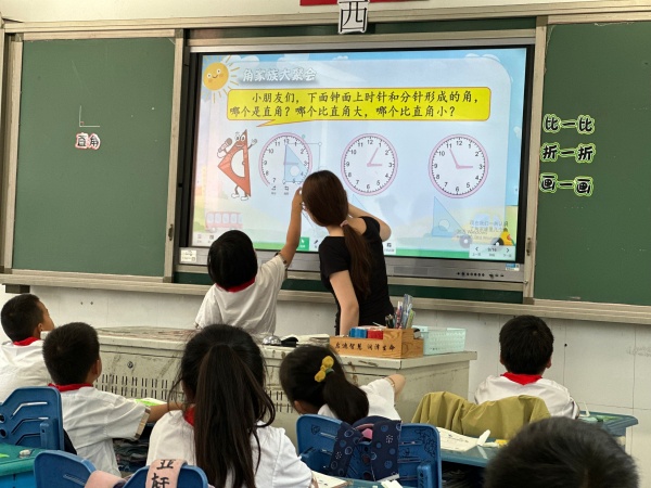 在二4班教室里,翟红英老师执教了一节研究课—《认知直角、锐角和钝角》。整节课以结构化视角进行活动设计,让学生在已有知识与经验中学习新知识、积累活动经验。学生通过“比—折—画—找”等一系列多元联动的数学活动,丰富了直角表象,在一次次的感知、比对、验证中,加深了对直角、锐角、钝角特征的掌握,环环相扣,由浅入深。