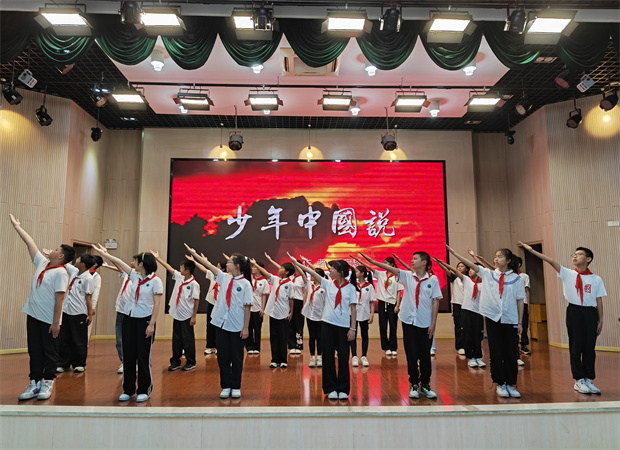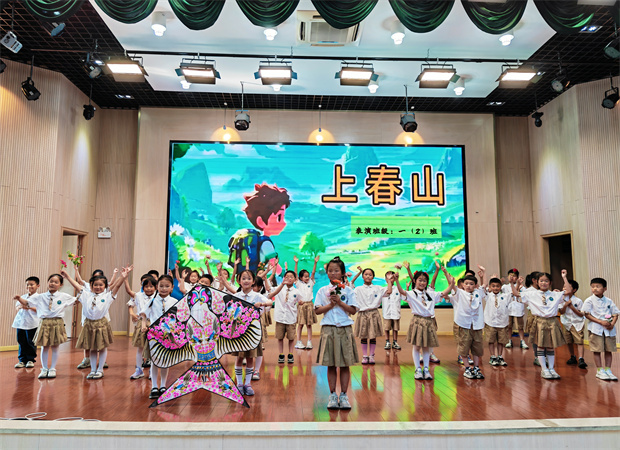 5月21日午后,报告厅内童声如泉,清泠悦耳。一(1)班《小池》似一幅水墨丹青,"小荷才露尖尖角"的意境在稚嫩歌声中徐徐展开;一(2)班带来的《上春山》若一卷春游图册,踏青赏春的欢快随着轻快步伐跃动;一(4)班的扇子舞《半生雪》如一阕古典诗词,小演员们用童声吟唱出千年韵味。二(2)班的《祖国祖国我爱你》则如溪流汇入江海,孩子们用更加饱满的情感,将爱国情怀化作动人的旋律,在整齐的和声中绽放光彩。这场童谣之约,不仅是声线的较量,更让低年级孩子在音韵流转间触摸传统文化的温度。