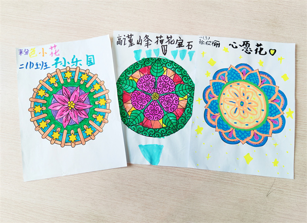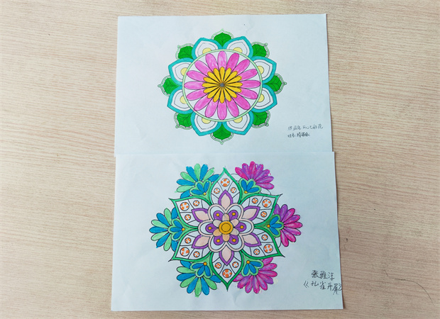 一、二年级的孩子们手握彩笔,在曼陀罗图案中编织梦幻世界。圆形的图案如同心灵的镜像,孩子们用明黄的向日葵、湛蓝的星空填满空白,在作品旁认真写下 “画的时候很开心”“觉得自己像住在彩虹里” 的稚嫩感悟。那些歪歪扭扭的字迹里,藏着对美好的纯粹感知,也让老师们看见:当心灵被允许自由表达,每个孩子都是天生的 “疗愈师”。
