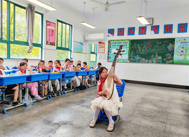在自主策划的才艺展示环节,各年级学生化身 “小小艺术家”,将课堂所学与个性创意巧妙融合。一年级的葫芦丝独奏清脆灵动,金色的葫芦丝在阳光下闪烁,宛如一个会唱歌的小葫芦在舞台上蹦跳;二年级的尤克里里弹唱活泼俏皮,孩子一边拨弦一边摇晃着身子,琴弦上的蝴蝶结随着节奏轻轻颤动;三年级的古筝独奏韵味悠长,指尖在琴弦上流淌出层层涟漪,仿佛将听众带入了晚霞映江的诗意画卷。