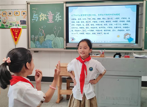 "你化我猜"游戏精彩上演,同学们两两一组展开默契大比拼。一位同学根据屏幕上闪现的词语,用生动的肢体语言进行演绎——时而抓耳挠腮模仿"孙悟空",时而做出谦让的动作表现"孔融让梨"。另一位同学则全神贯注,在规定时间内快速猜词。现场气氛紧张又欢乐,猜中时的击掌欢呼,失误时的扼腕叹息,都让这个传统游戏焕发出新的活力。最考验反应力的 “对着干大挑战” 中,孩子们时而向左转、时而向后退,偶尔做错动作的 “小迷糊” 慌忙学小猫 “喵喵” 叫,惹得围观者笑出眼泪。