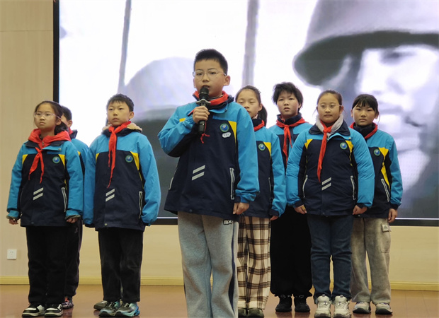 升旗仪式后,四(4)中队的队员们缓步走上台,开始了主题为《历史的回响,青春的回声》的朗诵。他们身着整洁的校服,神情庄重而明亮。清澈的童声如溪流般流淌在宁静的校园中,字句间既有对历史的深沉回望,也有对未来的热切期盼。“历史是镜子,照亮前行的路;青春是火炬,点燃希望的光……”朗诵虽简洁,却在平实的语言中传递出厚重的情感,展现了新时代少年对历史的尊重、对和平的珍视,以及奋发向上的精神风貌。