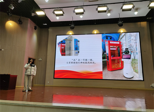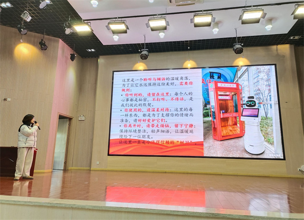 随后学校学生发展处裴老师向全校师生正式介绍了校园心理健康教育的新伙伴——人工智能“小灵”,以及专门为心灵成长设计的“心语亭”。