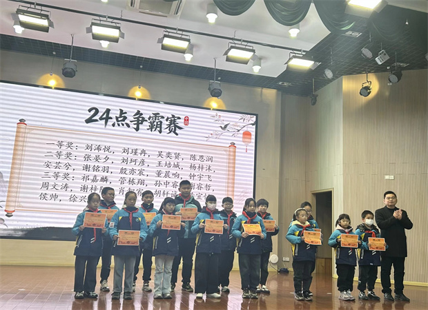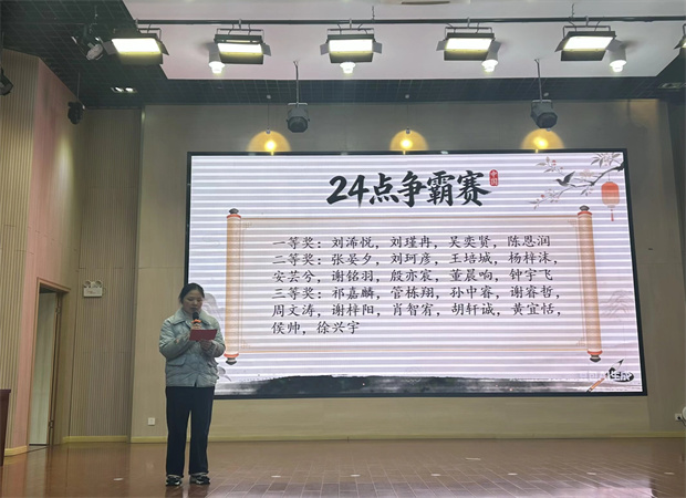 紧接着,“24点争霸赛”获奖名单由丁老师宣读。这场融合速度、思维与创意的竞赛,展现了同学们在数学天地中的敏捷与光华。获奖学子自信登台,笑容如星。他们用数字演绎逻辑,用智慧点亮舞台,生动诠释了学校“在活动中学习,在挑战中成长”的教育理念。