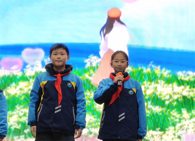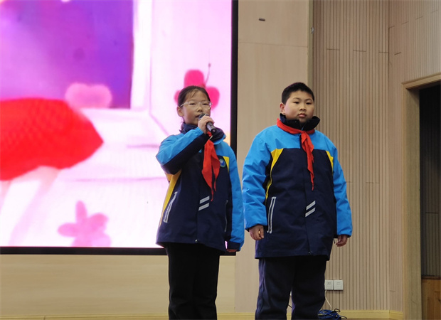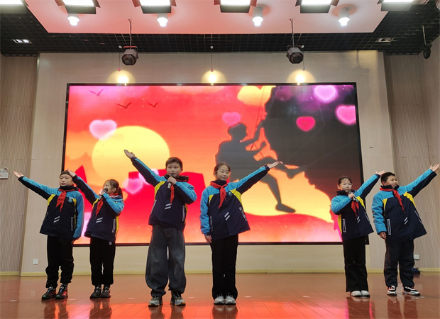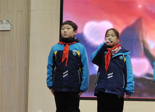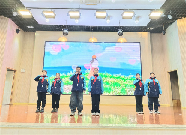 “感恩,是校园里最温润的那一枚石头。”在主持人的娓娓道来中,四(5)中队的六名队员带来了表演《心怀感恩》。他们通过情景朗诵与肢体语言,将日常生活中那些容易被忽略的温暖瞬间——门卫师傅的问候、同学间的讲题、课堂上的专注、家书里的牵挂——细腻呈现。真挚的情感流淌在舞台上,掌声久久不息,仿佛溪水轻响,浸润心田。