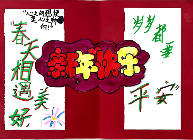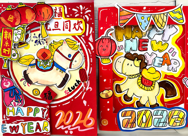 孩子们通过剪、粘、贴、画、写等方法制作新年贺卡,以独特的方式迎接新年的到来。有的用红卡纸做底,画上憨态可掬的小马图案,让马年的生肖元素跃然纸上;有的剪出彩纸灯笼、福字贴在内页,让贺卡变得立体又有趣;还有的在空白处写下温暖的寄语,把对新年的期许和对亲友的祝福一笔一划融入文字里。瞧,一张张精美的贺卡,宛如一艘艘充满爱的小船,满载着孩子们的深情厚谊,传递出他们最真挚的祝福和对生活的热爱。