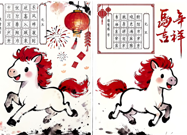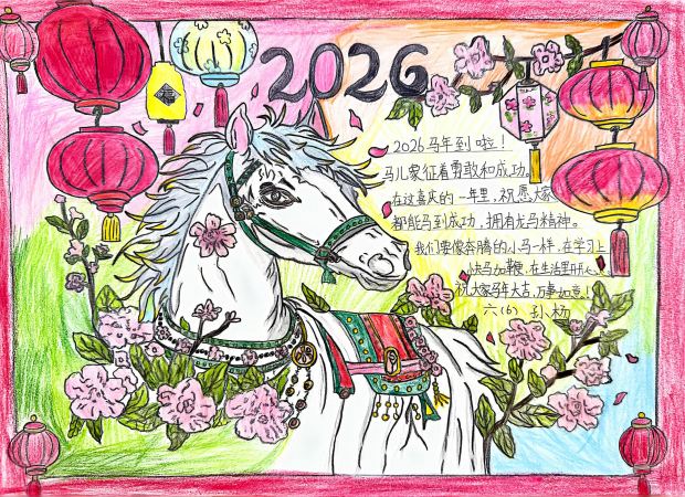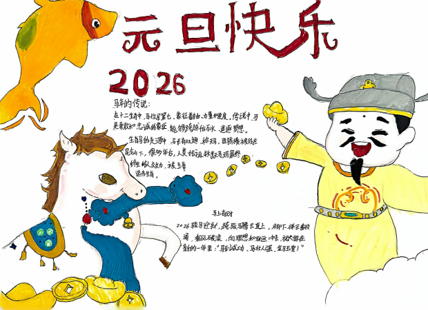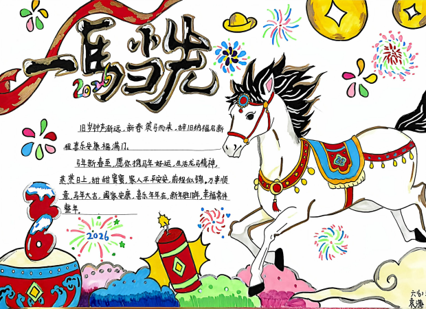 孩子们围绕元旦主题创作手抄报,将马年元素巧妙融入其中:有的以奔马作为画面核心视觉,骏马昂首奋蹄的模样鲜活灵动;有的摘录“龙马精神”“马到成功”等吉祥话语,写下满是美好期许的新年祝福;还有的结合民俗知识,娓娓道来马年的文化底蕴。每一份作品都色彩明快、构思精巧,既展现出孩子们扎实的书画功底,更让传统生肖文化与元旦节日氛围相融相映,绽放出独特的魅力。