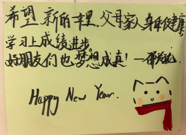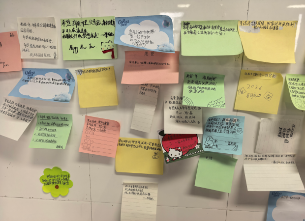 孩子们以笔为媒,书写对新年的美好期许与祝福。瞧,有的同学写下对学业的追求:“愿在新的一年里突破学科瓶颈,成绩更上一层楼,为梦想全力以赴”;有的表达对友情的珍视:“希望同窗情谊长存,我们一起在青春的赛道上并肩前行,共享喜乐,共担风雨”;还有的传递对生活的热爱:“保持热爱,奔赴山海,愿新的一年平安顺遂,每一个日子都充满阳光与希望”。一张张小小的便利贴,字里行间满是对未来的憧憬。这些饱含深情的寄语不仅展现了孩子们积极向上的精神风貌,更成为了校园里一道温暖而独特的风景线。