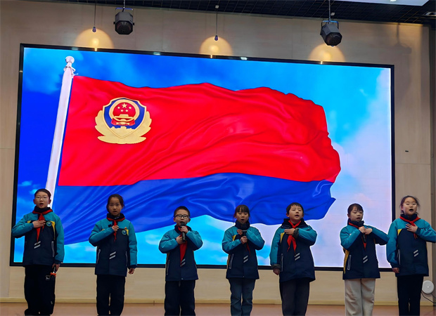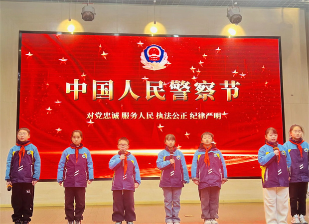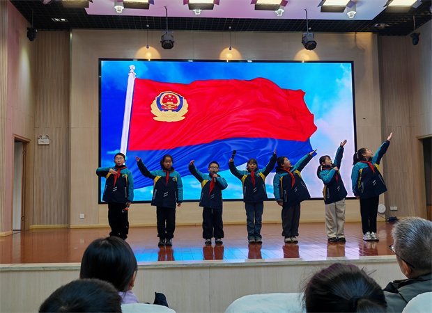伴随着庄严的氛围,三(2)中队的少先队员献上诗朗诵《藏蓝的信仰》。童声铿锵,情感真挚:“那抹藏蓝,是平安的底色;那份忠诚,是初心的光芒……”孩子们用诗歌诉说敬仰,以朗诵传递信念,将对人民警察的感恩与追随,化作一字一句的深情告白,深深感染着在场的每一个人。