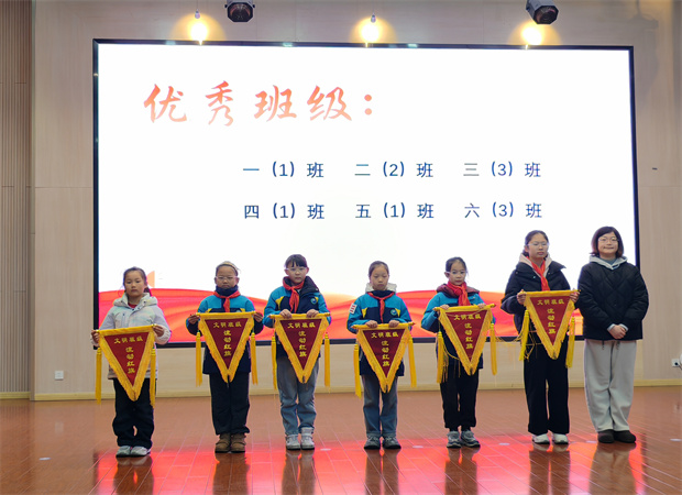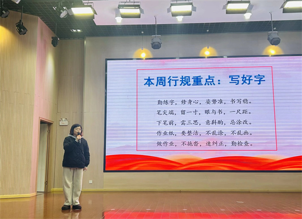 仪式尾声,裴翠夏老师为表现优异的班级颁发流动红旗,以此激励全体学生再接再厉、共创佳绩。随后,她结合本周行规重点——“写好字”的深刻内涵,寄语全体学生:正如人民警察以忠诚担当书写平安答卷,我们更应以端正之心写好每一笔、每一字,在笔尖的起落间锤炼品格,在纸面的方寸间传承信仰。