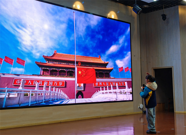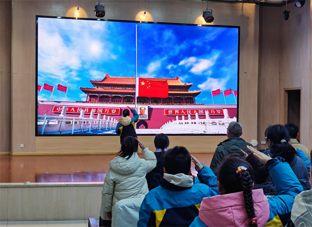 升旗仪式正式拉开帷幕。少先队员身着蓝色冲锋衣、佩戴鲜艳红领巾,全体师生精神饱满、意气风发。伴随着雄壮的《义勇军进行曲》,五星红旗冉冉升起,少先队员行队礼,其他师生行注目礼,目光追随着国旗,现场洋溢着庄严肃穆的氛围。