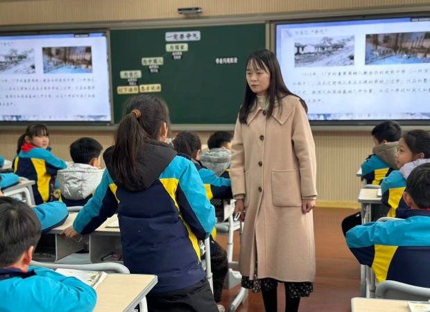 随后,百草园小学郑玉蓉老师带来三年级新教材课文《一定要争气》。郑老师紧扣单元语文要素“带着问题默读”,以“争气”为主线,设计“从问为引—从问为线—以问为核”三大任务,引导学生梳理文本、品读人物、联系生活。她通过资料拓展、字词辨析、情境讨论等方式,将童第周“为自己争气”“为国家争气”的精神层层展开,落实了立德树人的课程目标。