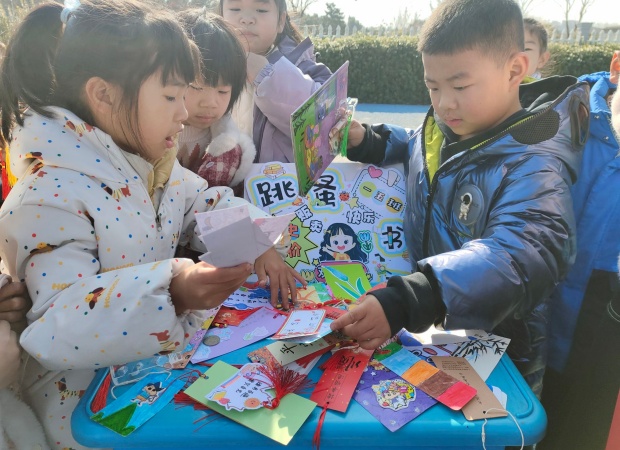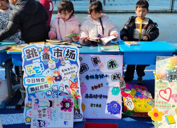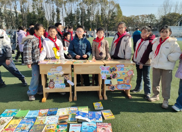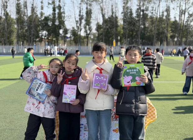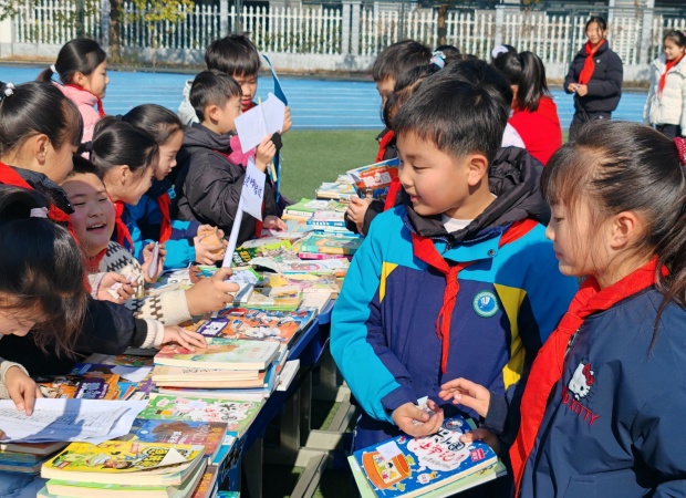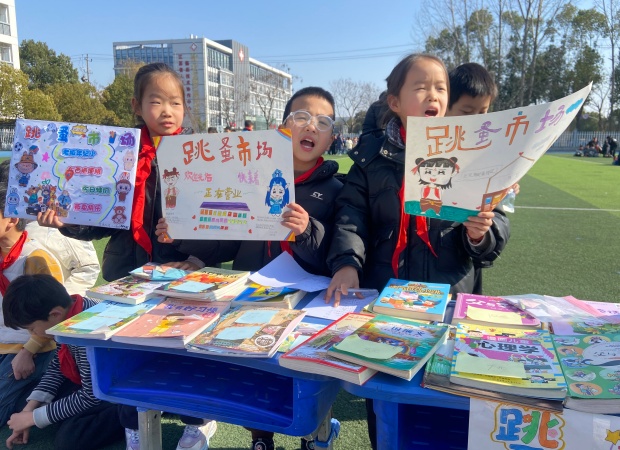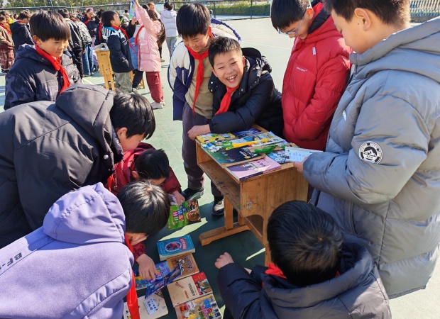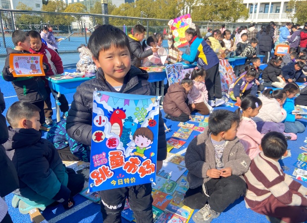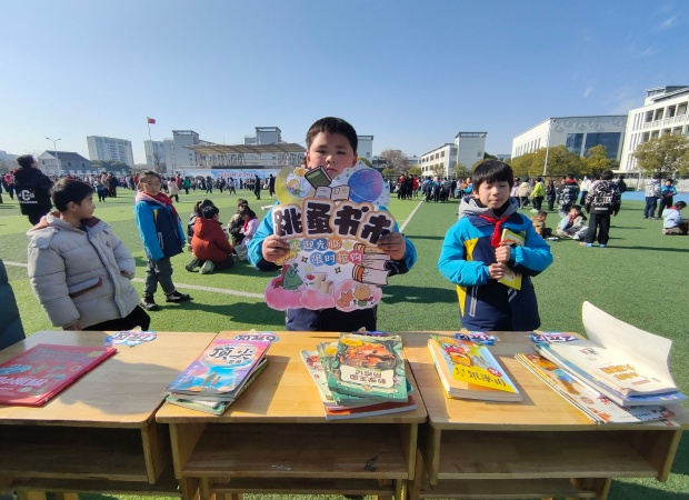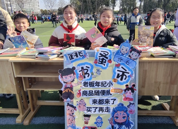 一到活动时间,操场瞬间焕发出蓬勃生机。一个个书摊错落有致、整齐排列,绘本童话、科普典籍、中外名著等读物琳琅满目,墨香萦绕间宛如一座座微型“移动书斋”。“好书传情,以易会友,快来挑选心仪读物!”“来来来,走过路过别错过哦!”小掌柜们主动上前招揽顾客,条理清晰地介绍书籍,每个书摊前都聚拢起不少身影。他们从容议价、灵活应变,稚嫩的嗓音里满是对阅读的挚爱,以真诚传递文字力量。