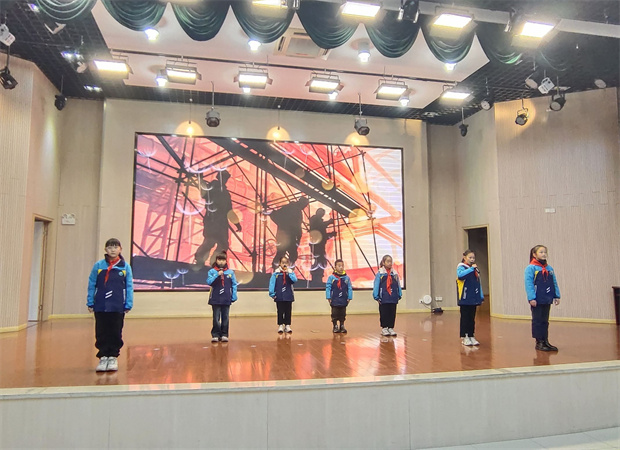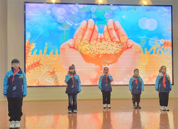 话音落下,诗声扬起。三(3)中队八名队员款步登台,以一首《勤俭之花》将仪式推向温情的高潮。清澈的童声,如溪流般在会场流淌:“那是汗水的凝望,是物力的诗行;那是古老的叮咛,在新时代回响……”诗句如花,缓缓绽放;节俭之德,藉由声音沁入心田。这一刻,抽象的美德化为了可触可感的意象,在聆听中生根,在共鸣中发芽。