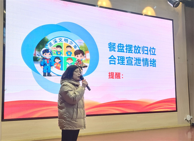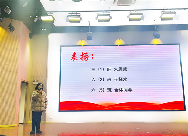 随后,裴翠夏老师宣布了上周“流动红旗”获得班级,并特别表扬了在“跳蚤书市”中拾金不昧的同学,称赞他们以实际行动诠释了“勤俭惜物,美德在心”。她进一步围绕“餐盘归位”与“情绪表达”开展行为规范教育,引导同学们从小处着手、从细节做起,在日复一日的践行中,涵养文明,温润成长。