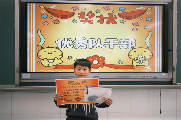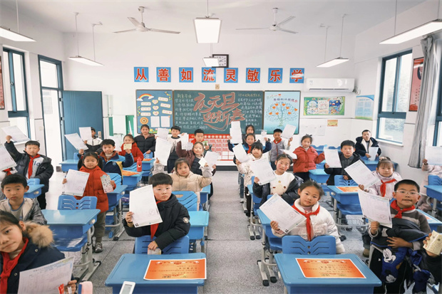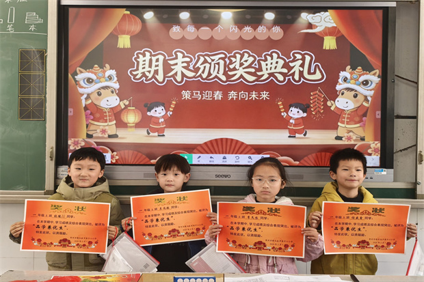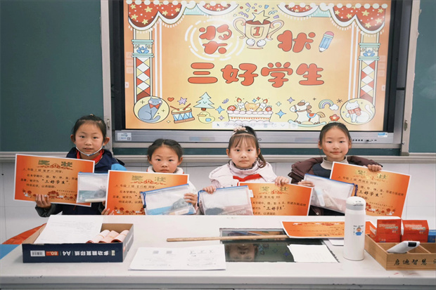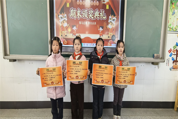 表彰环节温情满满,各班教室里洋溢着喜悦与荣光。班级表彰环节,班主任及任课教师结合学期表现,为荣获“三好学生”“品学兼优生”“优秀队干部”“进步奖”的各类优秀学生颁发奖状与奖品。一张张奖状镌刻着努力与成长,一阵阵掌声传递着榜样的力量,满室暖意中洋溢着积极向上的氛围。表彰结束后,班主任逐一为孩子们发放素质报告单,送上有针对性的学期总结与温情祝福,让每位同学都带着收获与期许开启寒假。