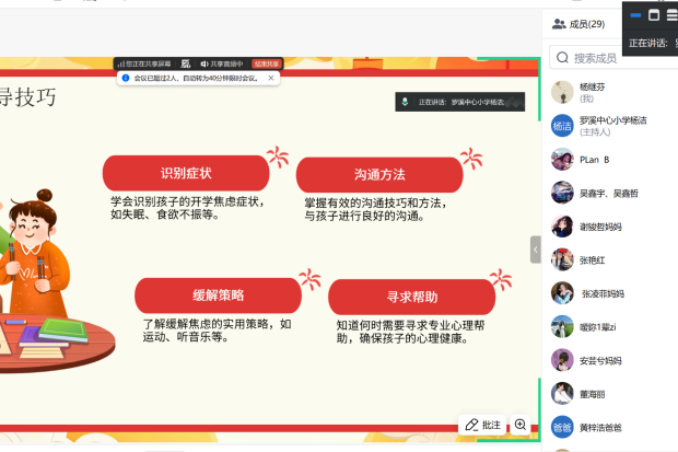 在“收心指南·心理调适”环节,班主任们化身“成长引路人”,从学生和家长双重视角,娓娓道来开学前的“收心秘籍”:今晚早睡,明早早起,让生物钟与校园同步;最后一次查漏补缺,让作业完美“归队”;将电子产品移出卧室,还孩子一方宁静天地。同时,面对可能出现的“开学焦虑”,班主任们贴心支招:多一份倾听,少一份指责;陪孩子包一次书皮、理一次文具,让仪式感告诉大脑——“要开学了”。会后,丁凤玲老师录制的《开学心理调适微课》也将推送到群,让关爱持续在线。