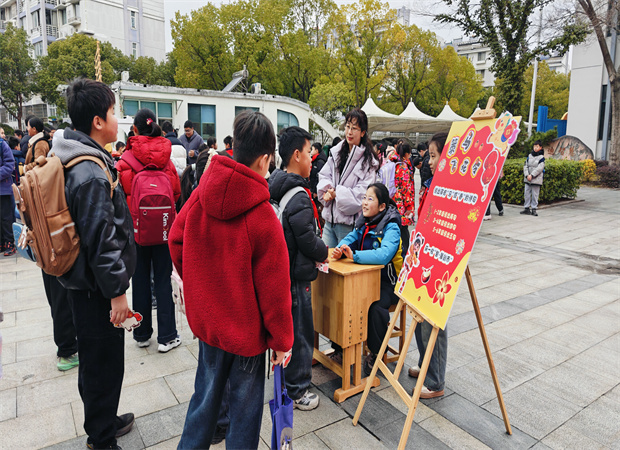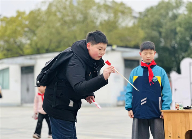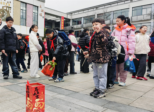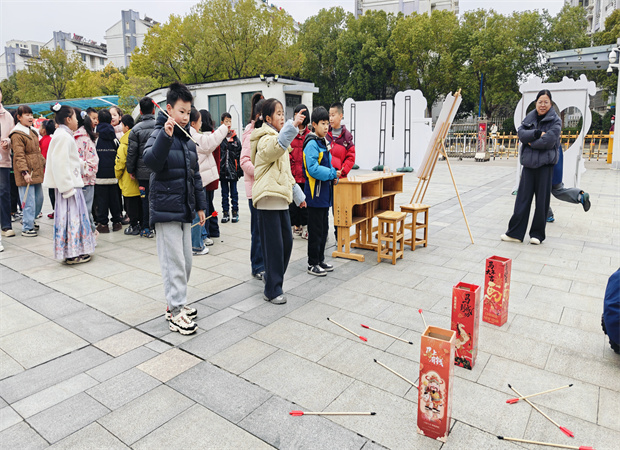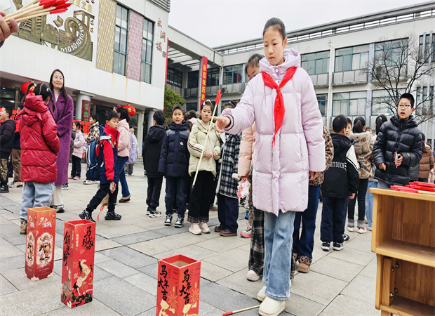 “万马投福壶” 区域里,热闹的欢笑声此起彼伏。孩子们手握箭矢,站在指定位置,屏息凝神,目光紧紧锁定壶口,轻轻一掷,箭矢在空中划出优美的弧线。投中者欢呼雀跃,眉眼弯弯;未中者也不气馁,重振旗鼓,再次尝试。这项古老的游戏,不仅锻炼了孩子们的专注力与手眼协调能力,更藏着 “百发百中、目标必达” 的美好寓意,愿每一位灵溪少年,在新学期都能目标明确,策马扬鞭,投中属于自己的 “幸福与荣光”。投中者收获的 “体・强健币”,更是对孩子们勇于尝试、坚持不懈的最好嘉奖。