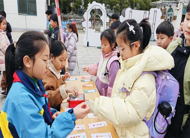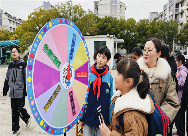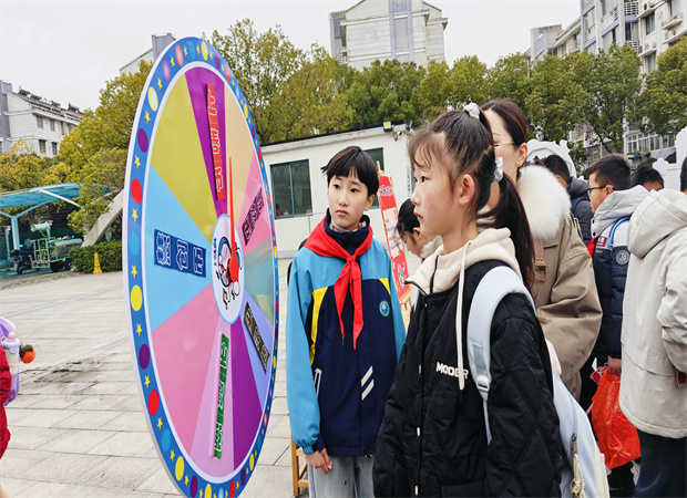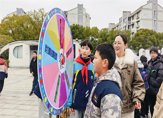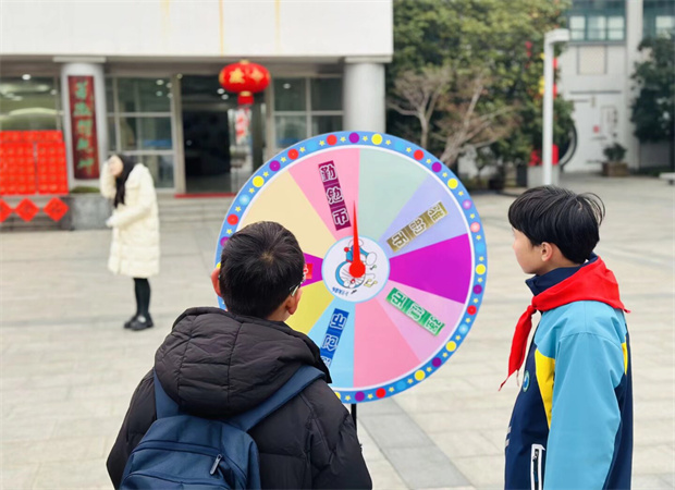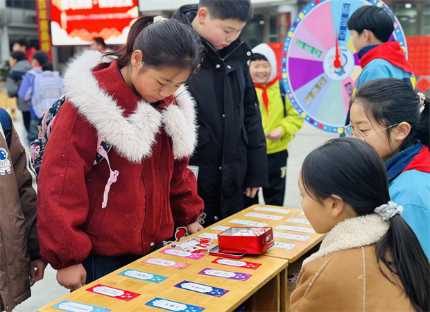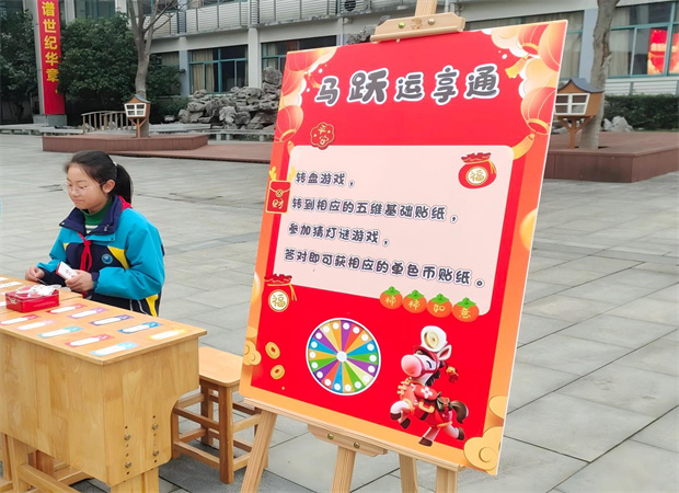 “马跃运享通” 幸运转盘前,孩子们排起了长长的队伍,一双双眼睛满是期待与好奇。彩色的转盘缓缓转动,指针落定的瞬间,便是一场趣味十足的灯谜挑战。孩子们低头思索,相互探讨,灵光一闪的瞬间,脱口而出正确答案,便收获相应颜色的单色币贴纸。指尖的转盘转动着惊喜,脑海的思索点亮着智慧,欢声笑语在校园里轻轻回荡,让新学期的开端,满是趣味与惊喜。