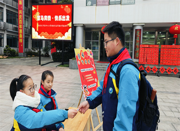 “春风得意马蹄疾,一日看尽长安花”“草色遥看近却无,绝胜烟柳满皇都”…… 校园的一隅,“策马飞花令” 环节正诗意盎然地开展。学校按 1-2 年级、3-4 年级、5-6 年级分学段竞答,孩子们以 “马”或“春” 为题,吟诗词、诵经典,稚嫩的嗓音清脆悦耳,穿越千年的诗词在春日的校园里回荡。每一位成功接句的孩子,都能收获一枚 “智・慧创币”。他们在诗韵中涵养心性,在诵读中点亮智慧,让文化的馨香,浸润灵溪少年的成长之路。