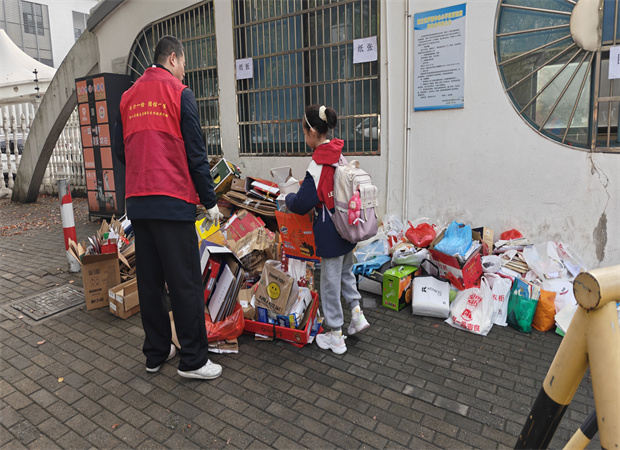种子既已种下,行动便随之而来。经过一个周末的精心准备,3月31日清晨放晴。阳光洒在校门口,空气里透着春日洗过的清爽。一条条队伍早早排起,那暖意比阳光更浓。同学们手捧叠得方方正正的废纸——有的是写满又擦去的草稿纸,有的是用过却依然整洁的作业本,还有的是从家里带来的旧报纸和包装纸。每一张纸,都被认真对待;每一份心意,都值得被看见。有的孩子小心翼翼地把纸放进回收箱,还不忘回头看看,好像在和它们道别;有的孩子兴奋地和同伴说:“这些纸能变成新的本子呢!”老师们也纷纷加入,将办公室的废纸整理归类,默默示范着“节俭”的模样。整个早晨,没有喧闹,没有催促,只有一份份安静的参与和温柔的行动。这些小小的举动,像一束束微光,在春日里悄悄亮起,点亮了整个校园。